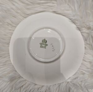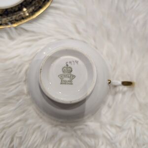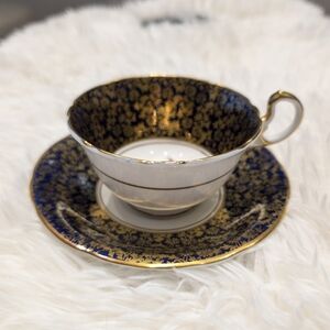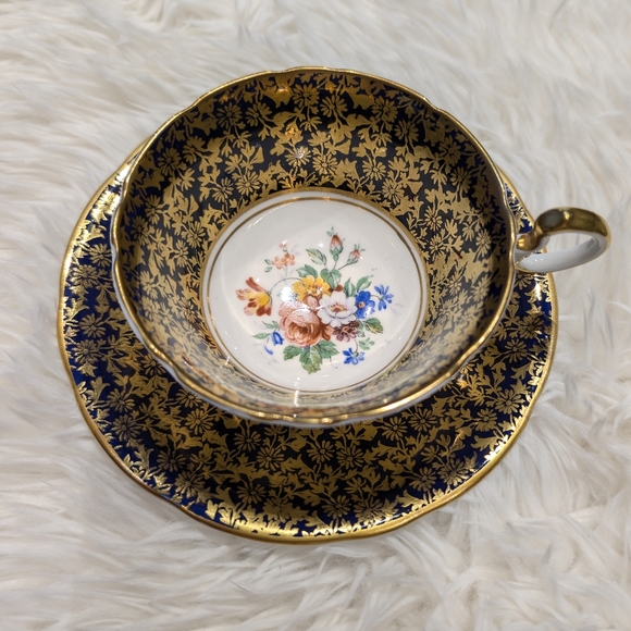 This Aynsley set features a deep blue band, floral center and heavy metallic gold trim details.