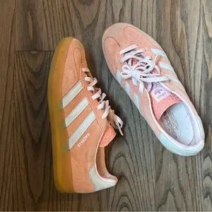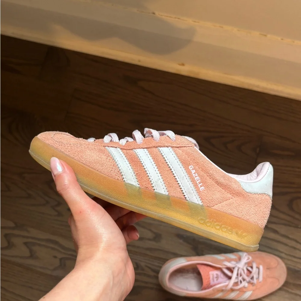 Stylish pink Adidas Gazelle with iconic white stripes. Purchased on Aritzia