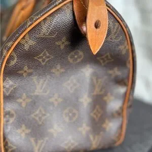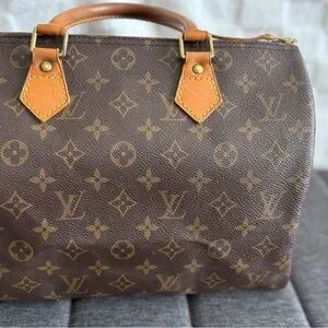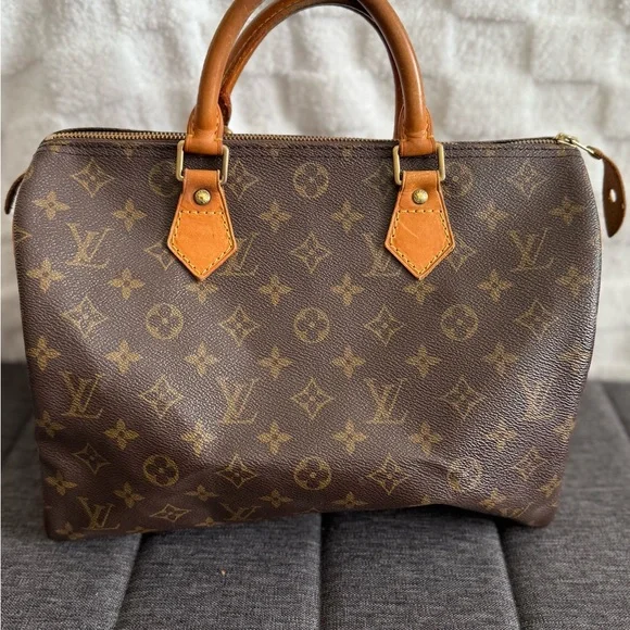 This Louis Vuitton satchel showcases the iconic brown monogram canvas, featuring a structured silhouette with natural vachetta leather handles. Its timeless design and premium craftsmanship make it a staple in any collection. Speedy 30 in good used condition