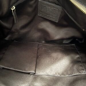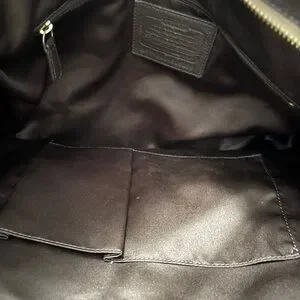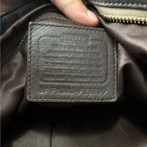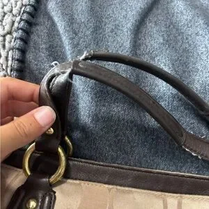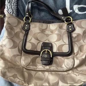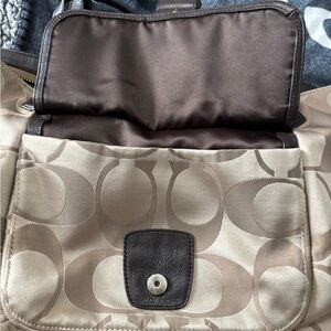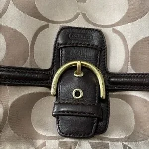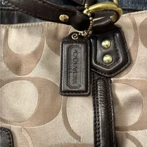 Elegant Coach shoulder bag with signature pattern. Features beige and dark brown tones. Ideal for versatile styling.