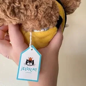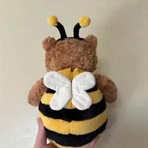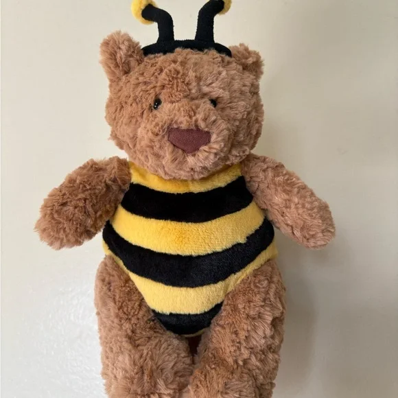 Charming Jellycat bear in a bumblebee outfit. Features soft brown fur and yellow stripes. Ideal for cuddles and playtime.