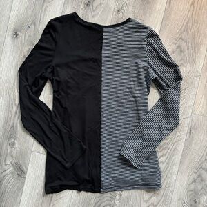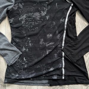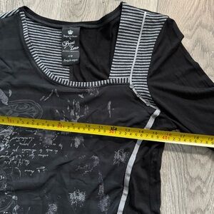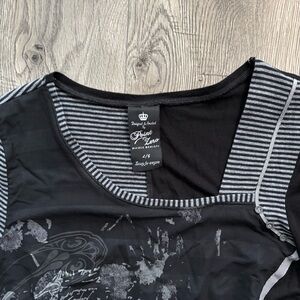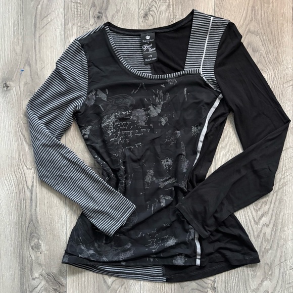 DETAILS: Y2K graphic design and striped sleeves, asymmetrical neckline, stretchy fabric