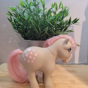 Adorable toy pony with pink mane and tail. Features a gray body with pink heart design.