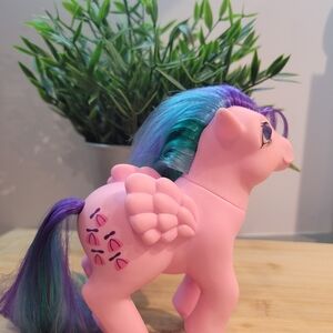 Delight your child with this charming pink toy pony featuring vibrant purple and teal mane. Perfect for imaginative play.