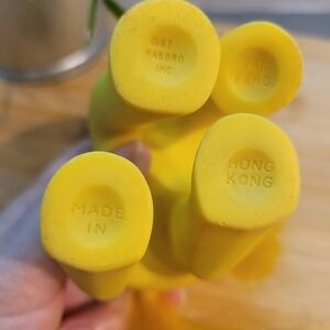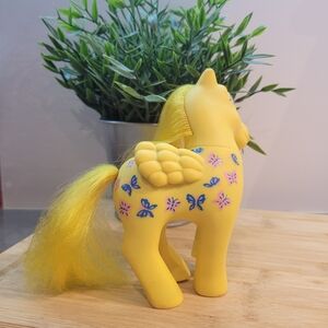 Bright yellow toy pony featuring colorful floral and butterfly designs. Long yellow mane and tail.