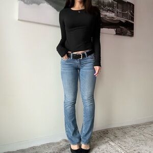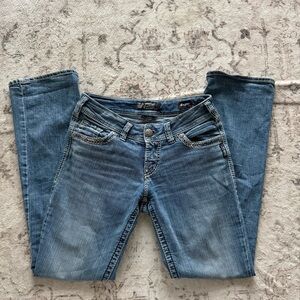 Authentic Y2K Silver Jeans with a slim fit and light wash denim. Features signature embroidered back pockets and a flattering early-2000s silhouette. Easy everyday pair with a true vintage feel.