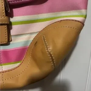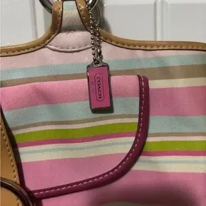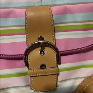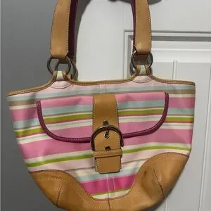 Stylish women's bag featuring a vibrant pink and tan striped design. Perfect for adding a pop of color to any outfit.