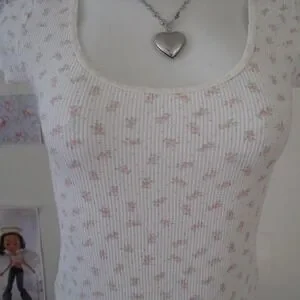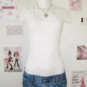 The cutest John Galt baby tee with a dainty pink floral print on a white waffle knit fabric. Super soft with a flattering scoop neckline and fitted baby tee silhouette. Such a good coquette / dollette staple.