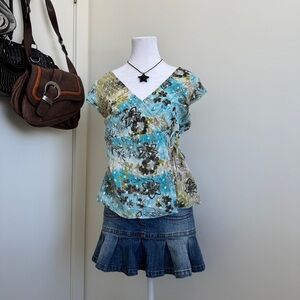 Stylish floral wrap top featuring a mix of blue and green hues. Perfect for casual outings.