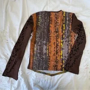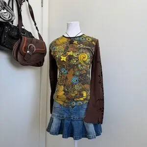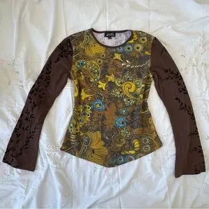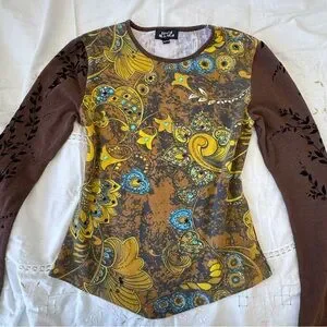 Elegant long sleeve top with floral patterns. Features rich brown and vibrant yellow hues. Ideal for a chic look.