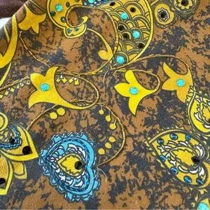 ⊹ contrast brown sleeves with flocked velvet floral over vibrant yellow + teal print