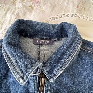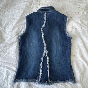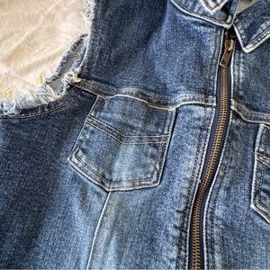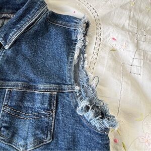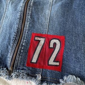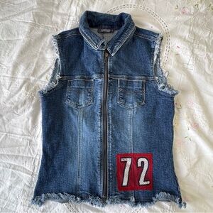 Stylish denim sleeveless vest featuring a bold red patch with the number 72. Frayed edges add a trendy touch.