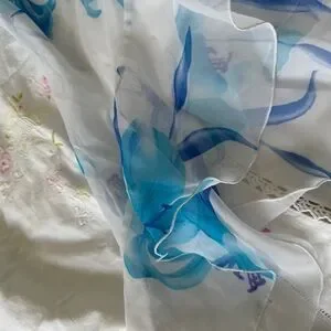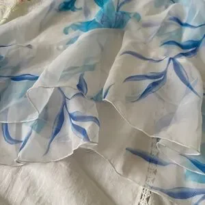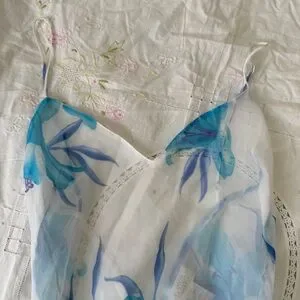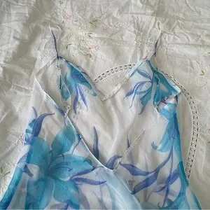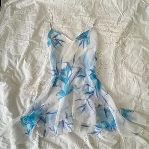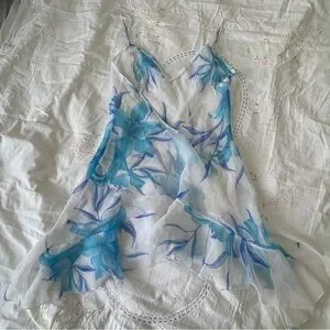 Vintage La Senza white chiffon babydoll dress with soft blue floral print. Lightweight and flowy with a layered hem that gives it that dreamy early 2000s vibe.