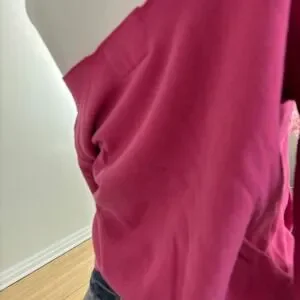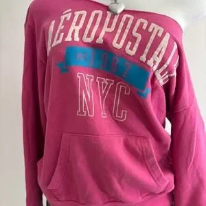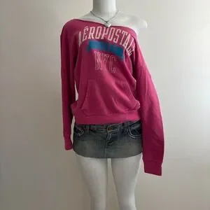 deep pink aeropostale graphic sweatshirt with nyc 1987 front print. customized off shoulder neckline with cozy interior + kangaroo pocket. cute comfy y2k lounge piece.