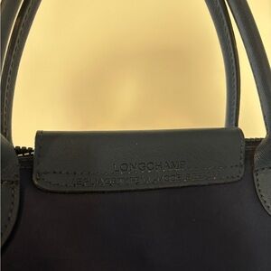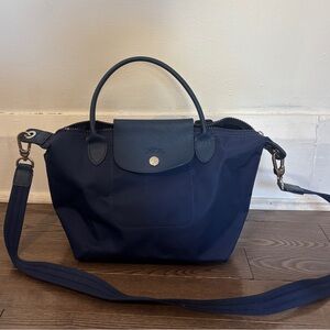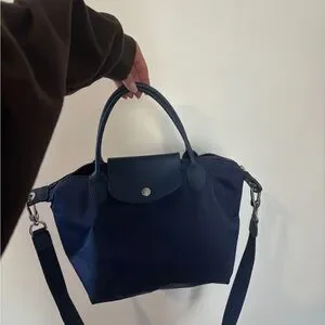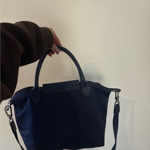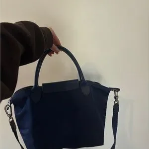 Stylish navy crossbody with top handles. Includes detachable strap for versatility.