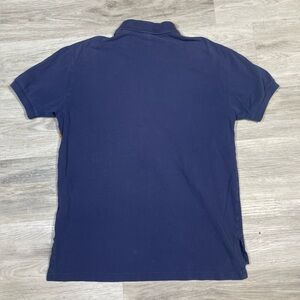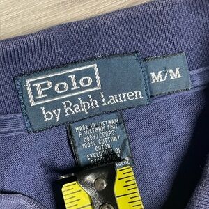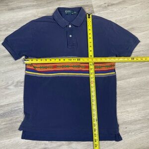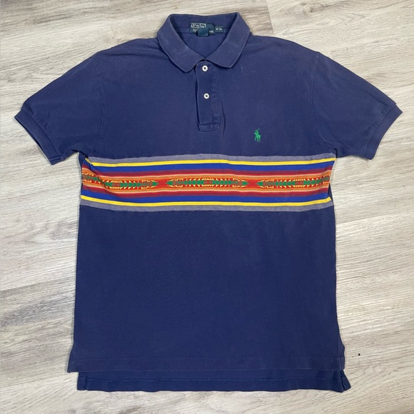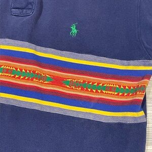 Navy polo with vibrant multicolor stripe. Classic Ralph Lauren style. Super rare with the aztec embroidery on that vintage polo tag. Fits a bit bigger as most 90’s polo Ralph lauren tend to do