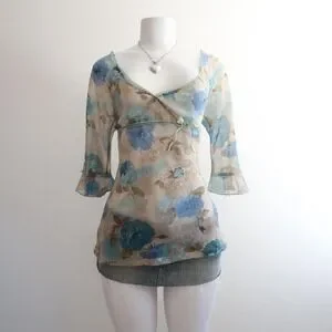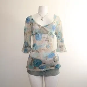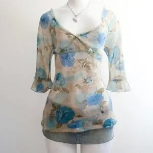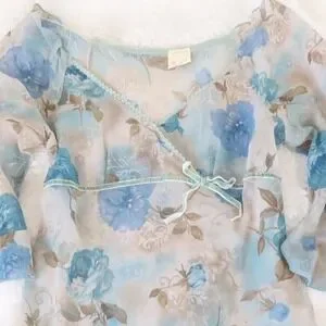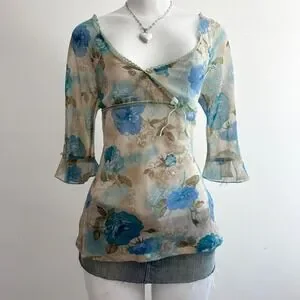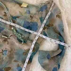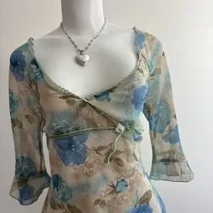 sheer blue floral wrap top with lace trim neckline and velvet tie waist. lightweight chiffon with bell sleeves creating soft fairycore y2k layering piece.