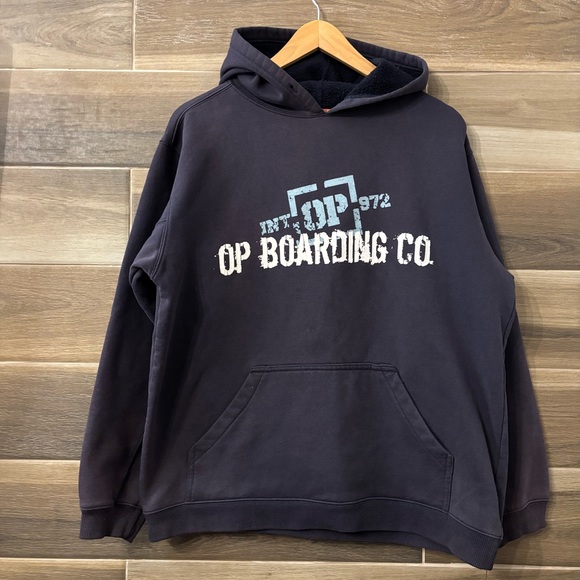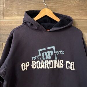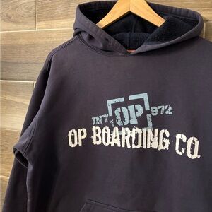 Vintage OP Boarding Co Ocean Pacific Navy Hoodie Large Surf Skate Y2K 2000s Fade