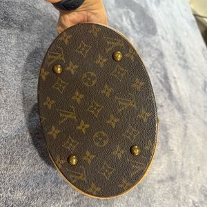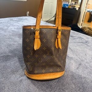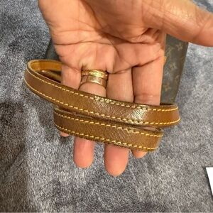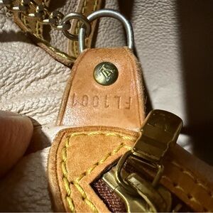 Elegant Louis Vuitton leather with gold hardware. Features intricate stitching and chain detail.