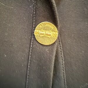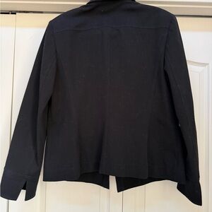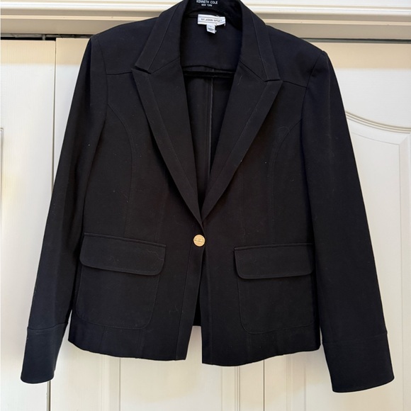 women's black cotton blend blazer featuring a gold button, two front pockets, and shoulder pads