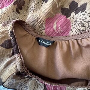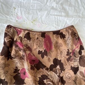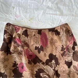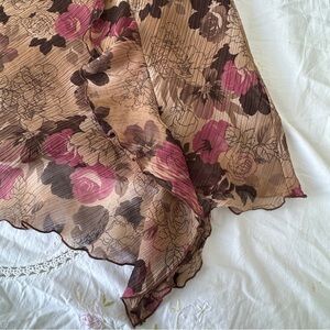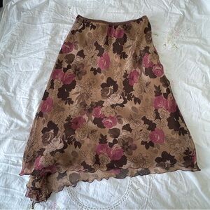Vintage Coupé chiffon skirt featuring a soft tan base with brown and pink floral print throughout. Designed with a flowy asymmetrical silhouette and ruffle hem for a romantic early-2000s look.