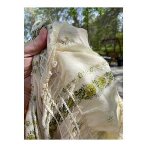 No size, brand or fabric tags. Very fine, tight-knit wool or wool blend textile. Geometric and floral print with a vertical double chevron jacquard pattern just visible. Wide stretch neckline can be worn on or off shoulder. No stains, holes or tears. Smocking at waist and wrist ruffle cuffs is losing, or has lost stretch. Remains lovely as is, or can be tailored. Pet and smoke-free studio.
