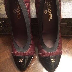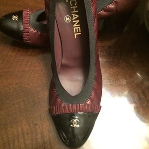 Authentic Chanel CC Ruffle Cap-Toe Burgundy Lambskin Leather Stretch Pumps. Made in Italy. Amazing condition with slight wear on sole.