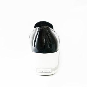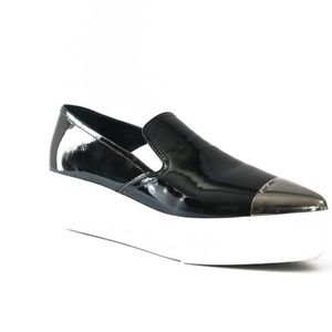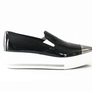 Brand new Nappa leather slip-on sneakers. Pointed metal cap toe featuring engraved logo. Elasticized gusset in white at sides. Rubber sole in white and grey featuring rubberized logo at heel. Tonal stitching. Approx. 2" platform. Upper: leather.Sole: rubber. Smallest width on sole from top 1”. Widest width on Sole approx 3.4”. Ensure your size in Miu Miu is 10. No returns. Note cap toe for sizing.