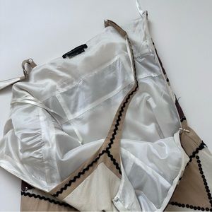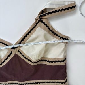 Beautiful cocktail dress from BCBGMaxazria with cream and brown colour blocking and sequin detail. 100% cotton. Entirely lined and has adjustable straps. Size label 6. Please see measurements in pictures.
