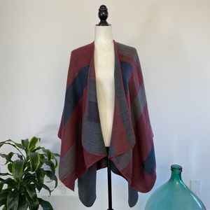 BNWOT. Perfect transition into fall with a reversible BB Dakota blanket wrap. Wear open, wrapped over one shoulder or super cute belted over skinny jeans. Great piece for layering, airplanes, or cold offices. Fun fall colour blocking in burgundy, greys & blue. Acrylic/poly blend. OS fits all, great amount of coverage.