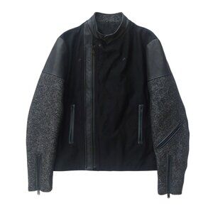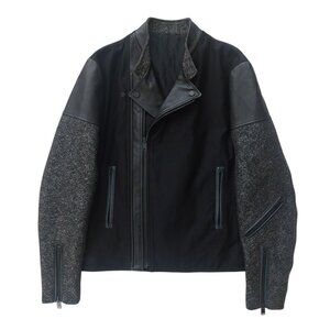 Cotton-blend biker jacket with black leather panels and trim throughout. Tweed panels on sleeves. Asymmetric zip fastening. Zipped pockets at the front, back, and left sleeve. Zipped cuffs. Quilted lining. Made in Italy. Shown in Fall 2012 Menswear lookbook in alternate colorway. Great condition, little to no signs of wear.