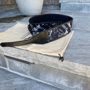 This Burberry Printed Belt is black and grey size Small. It hugs your waist!