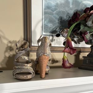 Want the reptile print without harming the reptile? Add in a statement textured look with this chic strappy sandal featuring an ankle strap, allover faux snake texture and on-trend cork heel and zipper closure.