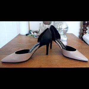 Established in 1968 in N.Y, U.S, Calvin Klein catered to working class as well as attracting upscale market. In 1975 Ck added licensed shoes to his clothes. Line and form is the focus of this chic 'Gloria' heel. At very wearable 3" / 7.6 cm heel, this pair includes a comfortable lightly padded foot bed supporting in all the right places making it a day to evening wear without wearing you out. Bold colour block points in satiny neutrals of Parisian Pink ( nude blush) contrast with a striking midnight black heel. Lengthening the leg this heel gives a peek of curved lines. Wear this to work and take this heel into the evening. This high quality heel is a perfect combination of very wearable glam mixed chic.