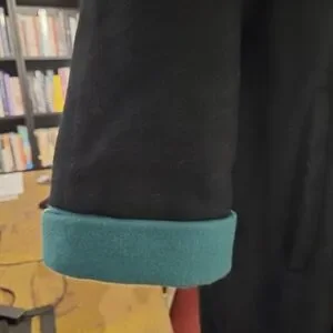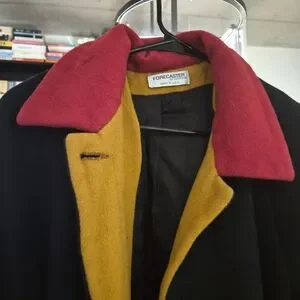 Stylish retro coat with a vibrant red collar and green chffs. Features a mustard yellow inner lining and black exterior. Perfect for adding a pop of color to your outfit.