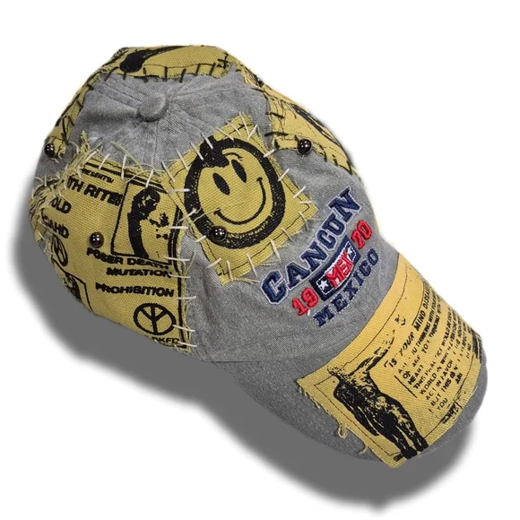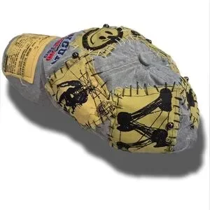 It's an acid washed strap-back ball cap with canvas patches encircling the dome, hand sewn embroidery encircling the patches, and metal studs through it all. We even patched the brim.