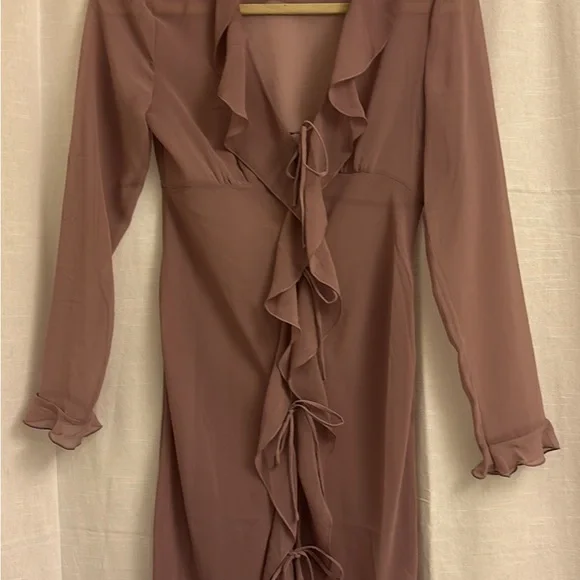 This elegant brown dress features a stylish ruffle front design, perfect for any occasion. Its sophisticated look is ideal for both day and night events.