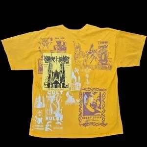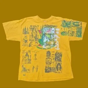 Graphic yellow t-shirt with custom prints on both sides.