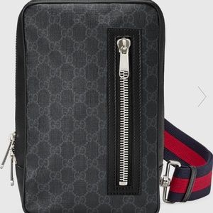 A small vertical pouch made from incredibly malleable soft GG Supreme. The adjustable strap features the House Web stripe in blue and red. Can be worn as a belt bag on the hip or waist, or as a cross body bag, front or backpack style, or one should.
