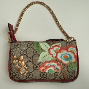 Gently worn Gucci Tian GG Supreme Coin Pouch with a gold Chain. Comes with all original packaging: dustbag, ribbon, info. card, authenticity card, Gucci silica gel packet, box.