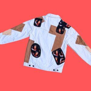 • Handmade, Upcycled Elvis Presley Patchwork, Beige and Brown Denim Jacket Size XS (Fits More Like a Size L)