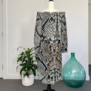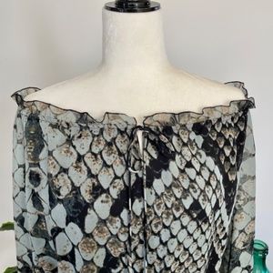 Jessica Simpson Hi/Lo dress in trendy snake print. Super comfortable elastic waist. Elastic ruffled neckline with front tie allows you to wear it off the shoulder or with open front and covered shoulders. Extra detailed long sleeves with ruffled cuff and 3 peekaboo cut outs up the arm (see photos for detail). Hi/lo skirt with rounded hemline and slight side slit.