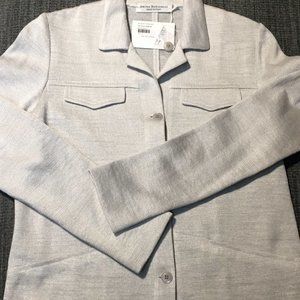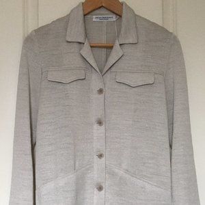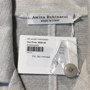 Knit linen-blend "Papavero" jacket by Amina Rubinacci, in color "Vapore" (oatmeal), size IT 42. Notched lapels, two faux flap chest pockets, two slanted patch pockets. Button closure. Unlined. 68% linen, 32% viscose. Made in Italy. New, never worn, with tags. Retailed for $950.