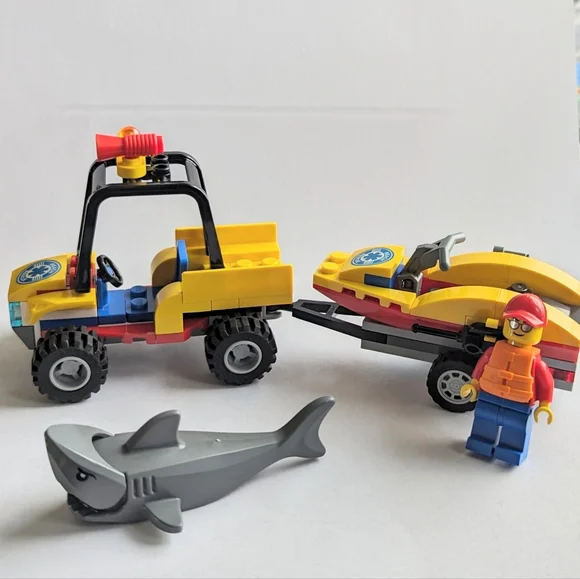 EUC built once, 74 parts minifigure and shark fun vehicle build with printed "BEACH RESCUE" logo all pieces and instructions included.
