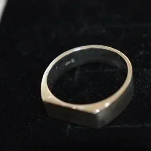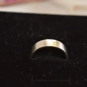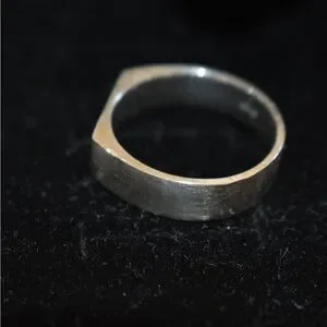 Silver ring, size 9. Shows signs of use, I tried to highlight it as best as possible in the photos. Nothing major but definitely some small dents and scratches.