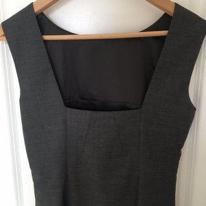 Mid-grey light wool sheath dress by Club Monaco, size US4. Sleeveless with a rounded neckline front and a deep cut square neckline in the back. Tonal symmetrical seams back and front at chest. Two vented slits in the back, side zipper. Fully lined. Content tags removed, but I recall it's 100% wool. Professionally care for, in mint condition. This is an awesome office/formal dress. Selling only because it's a bit tight for me now.