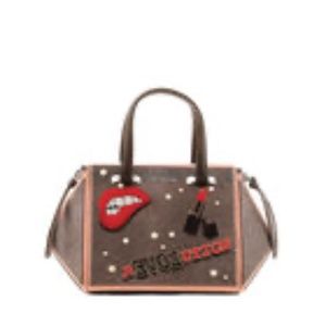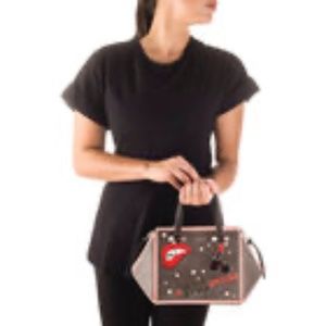 SOLD -Love is in the air. No need for airfares, custom fees or taxes. Step out in style with Candy. A geometric satchel/top handle bag with two handles made with metal leather and microfiber and enriched with pearls and embroideries on the front. Candy's shape is flexible, the sides can be pushed inwards for an even clearer geometric shape. Removable strap.1403973