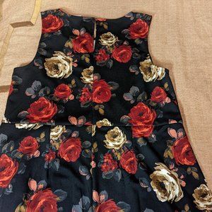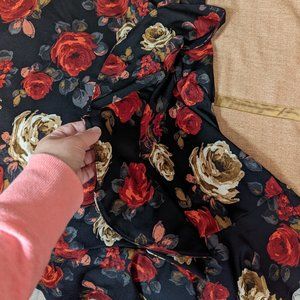 Super cute and flattering flower-pattern dress with ruffle accents. Moves beautifully and very comfortable to wear - has stretch!