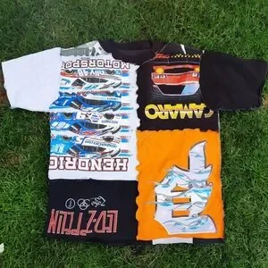 Patchwork tee made from cotton & polyester. Made in Canada .