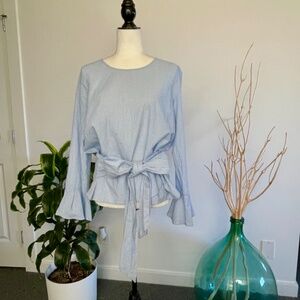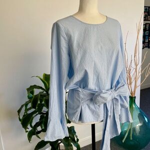 *SOLD* Pleione blue & white striped cotton blouse with romantic flared cuff sleeve and bow tie waist creating a peplum feel. Can be wrapped & tied front or back. Button keyhole closer at back.